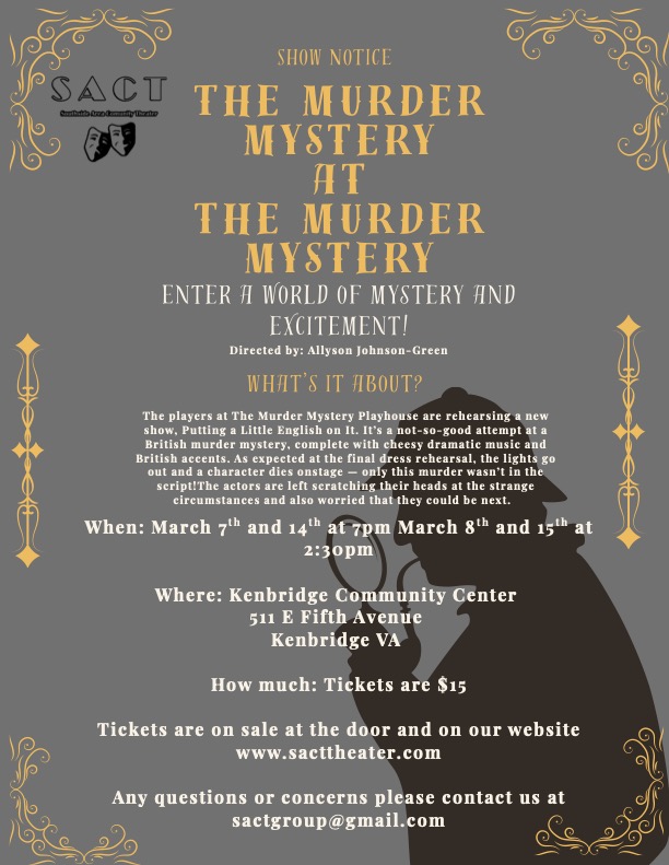 Tickets are now on sale for The Murder Mystery at the Murder Mystery! Show dates are March 7th and 14th at 7:00 and March 8th and 15th at 2:30.
