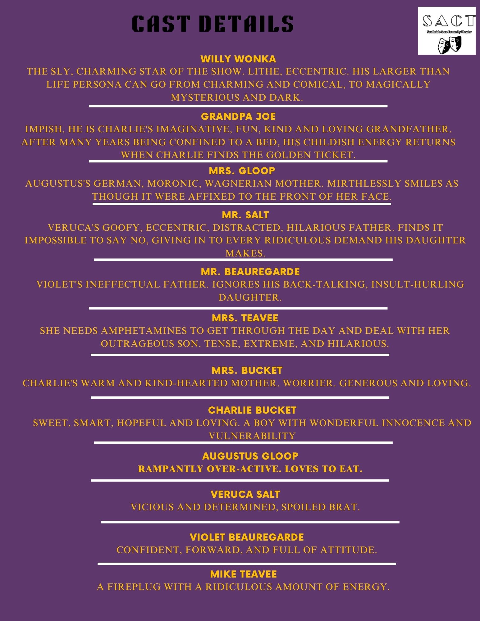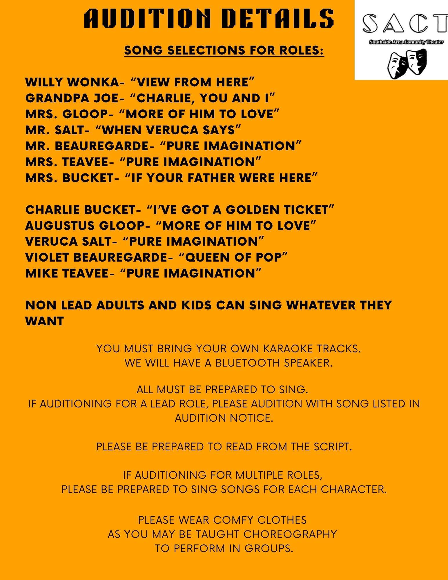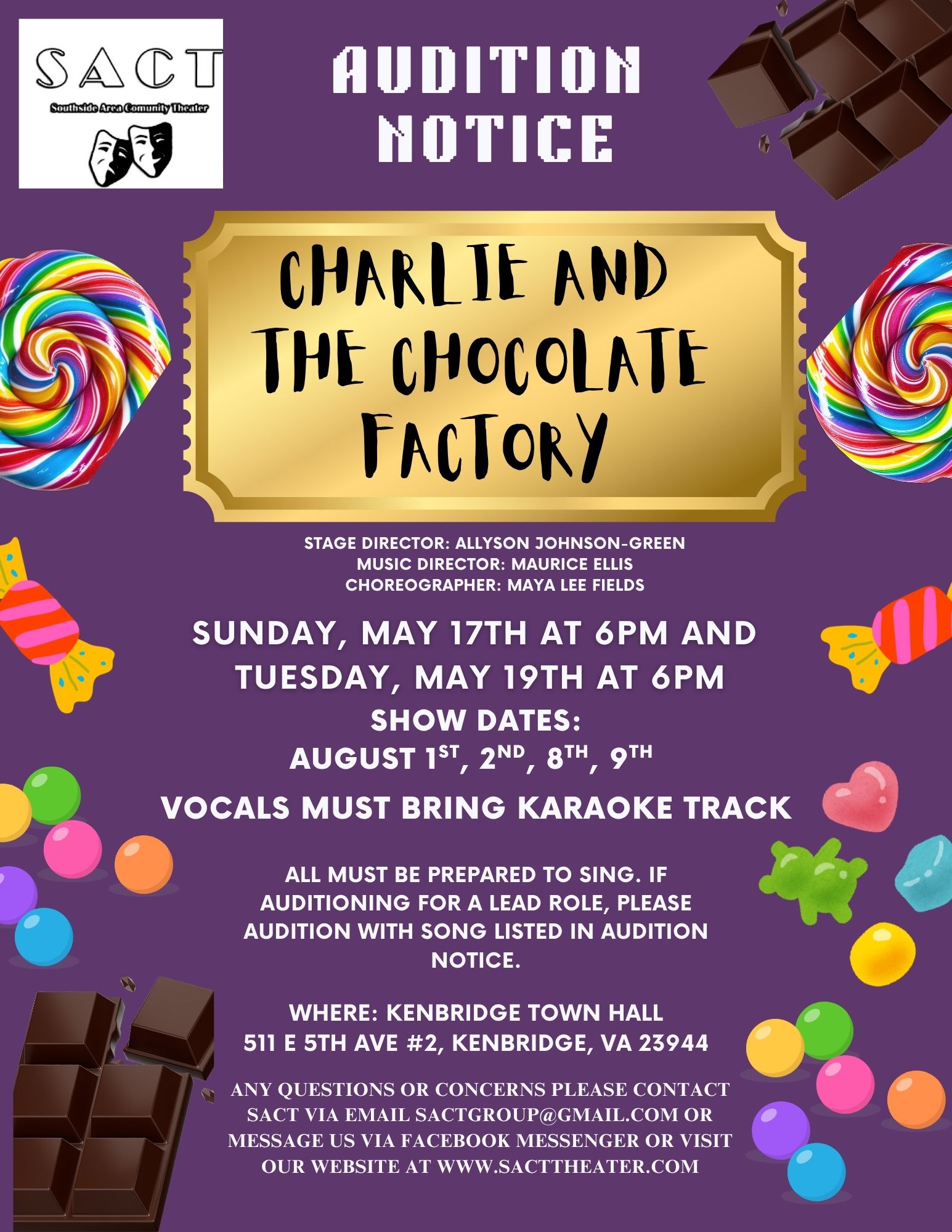 Auditions for Charlie and the Chocolate Factory are coming up! Show dates are August 1st, 2nd, 8th, and 9th. Tickets will go on sale in July.